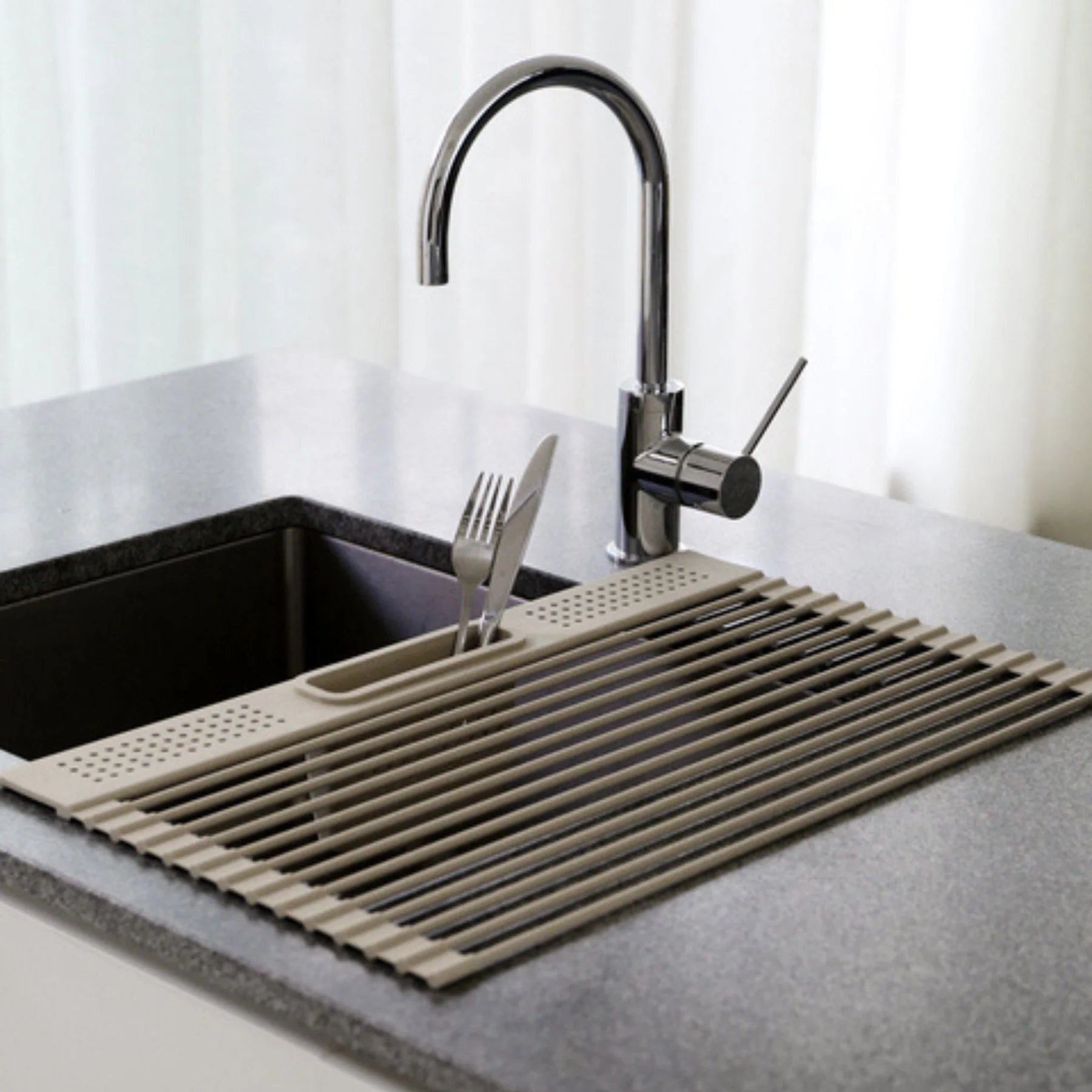 The Silicone Folding Dish Rack with Cutlery Holder offers a clever way to keep your kitchen organised and clutter-free.