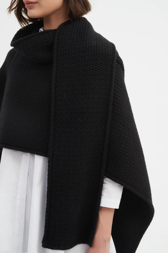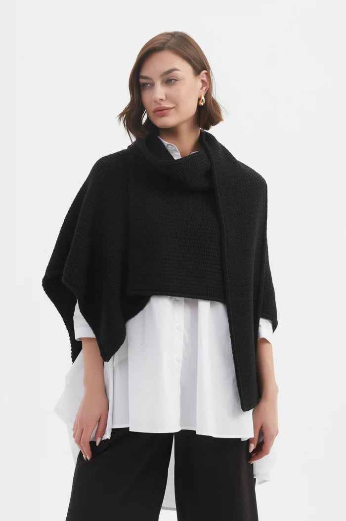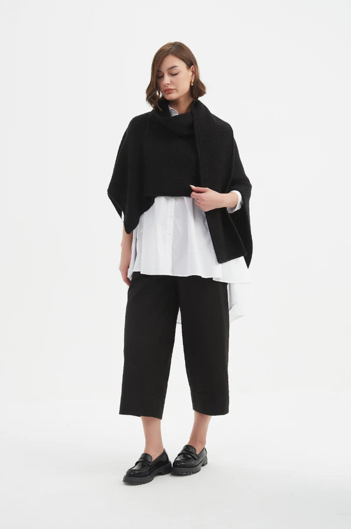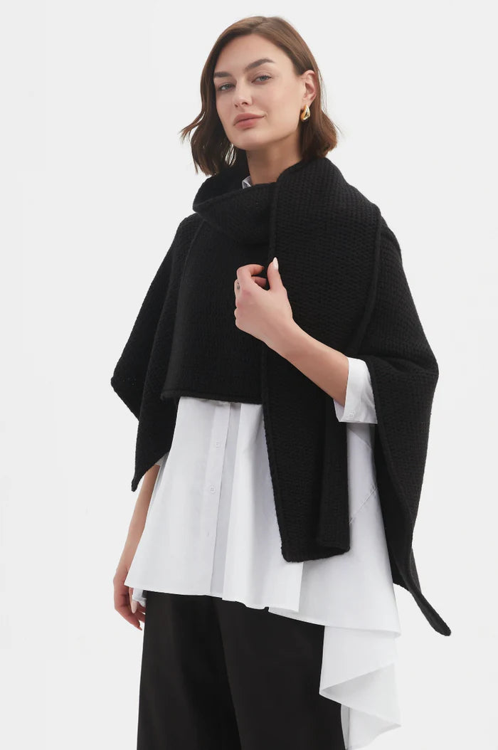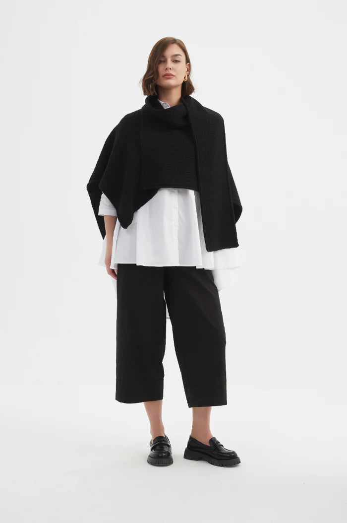 A modern twist on knitwear. The Asymmetric Wrap Knit is designed with a cropped silhouette and a relaxed fit, offering easy movement and refined appeal. A built-in scarf detail adds both warmth and a layered look without the fuss. Wear it over a fitted top or a classic shirt for understated style with an edge.